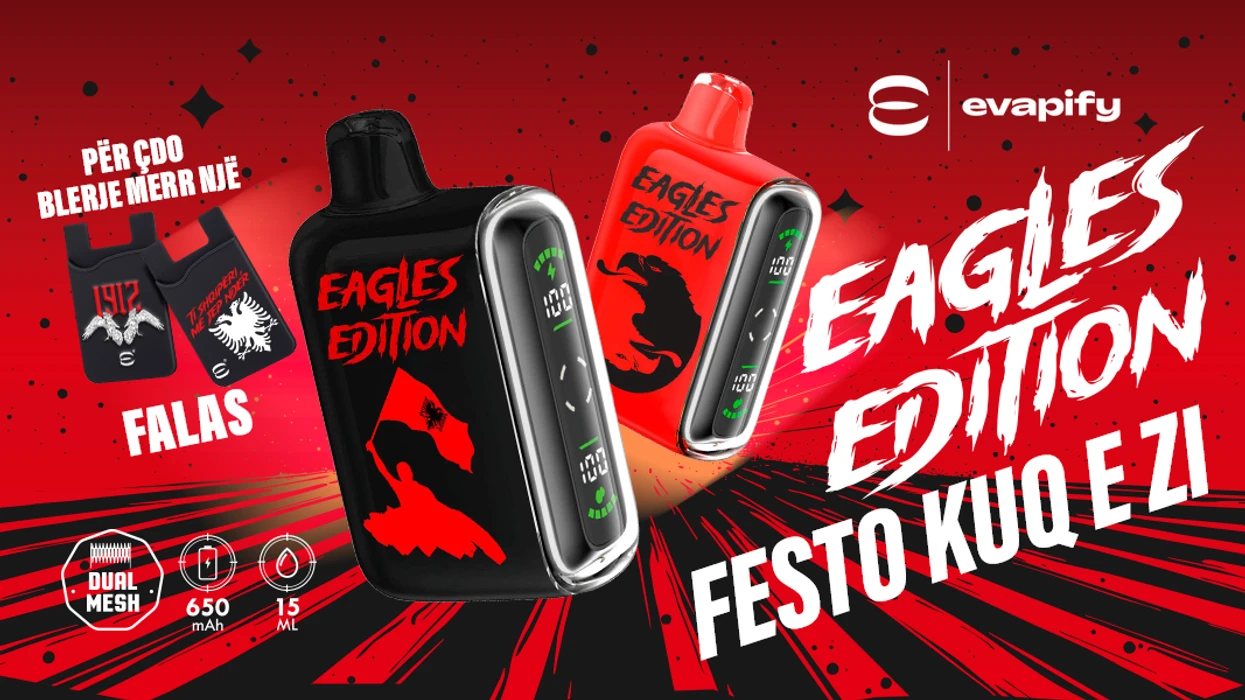 Në prag të festës së 28 Nëntorit, Evapify prezanton me krenari një edicion të veçantë e simbolik “Eagles Edition” një produkt që përfaqëson shpirtin, krenarinë dhe identitetin kombëtar shqiptar.Eagles Edition vjen me një dizajn që bashkon ngjyrat kuq e zi, të përforcuara me elemente tëshqiponjës dykrenare simbol i lirisë dhe unitetit tonë kombëtar. Eagles Edition është një produkt i limituar, i krijuar posaçërisht për festën e 28 Nëntorit dhe i disponueshëm vetëm për një periudhë të shkurtër kohore, keshtu që mos prit gjatë, bleje tani në pikat e shitjes Evapify ose në faqen zyrtare: evapify-ks.comPërtej dizajnit patriotik, Eagles Edition ofron teknologji të avancuar dhe performancë superiore. Me 20,000 puffs, bateri 650 mAh të rimbushshme, dhe kapacitet prej 15 ml, ky produkt garanton eksperiencë të gjatë dhe të qëndrueshme.Përdorimi i Dual Mesh Coilsiguron avull më të dendur dhe shije më të pastër me dy shije Bubble Gum Mint (3.5% Nic)dhe Apple Sour (2% Nic).Për ta bërë këtë edicion edhe më të veçantë, Evapify dhuron për çdo blerje një “Silicone Card Holder” falas, gjithashtu të dizajnuar me motive kombëtare shqiptare. Ky aksesor është perfekt për të mbajtur me vete kartat tuaja të përditshme, duke e kombinuar prakticitetin me stilin patriotik.Frymëzuar nga flamuri, krijuar për krenarinë shqiptare.