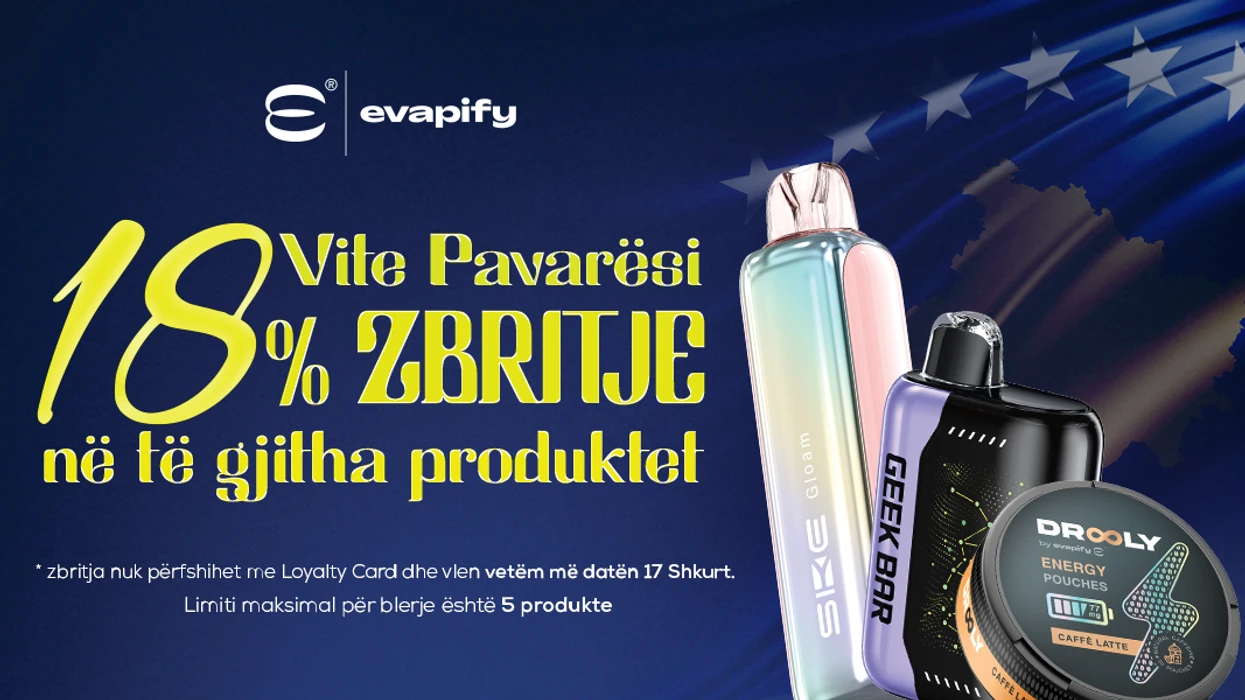 Për ta shënuar këtë moment, Evapify ka prezantuar kampanjën “18 Vjet Shtet, 18% Zbritje”, një koncept që lidhet drejtpërdrejt me simbolikën e këtij përvjetori.